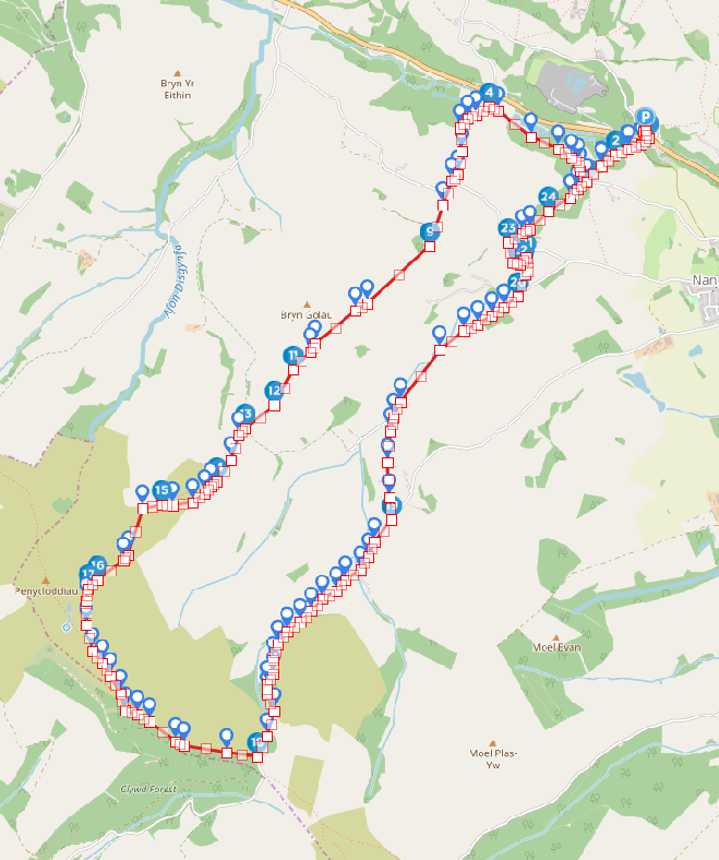 Follow the path to another stile (23) and pass through woodland with wigwams (24) and then a weir before rejoining the road at Nannerch Lodge. Follow the road back to the Cherry Pie.